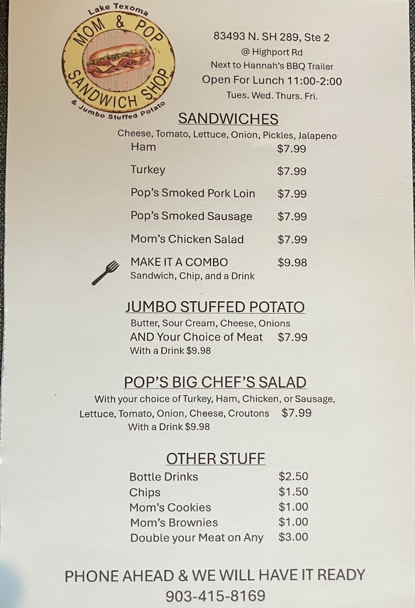 Step into the world of bold flavors and hearty bites with the Mom And Pop Sandwich Shop Menu at 83493 TX-289, Pottsboro, TX 75076. From the moment you glance through the options, it’s clear that every sandwich is crafted with care, stacking fresh ingredients and classic combinations in a way that feels both comforting and exciting. Whether you’re drawn to a perfectly toasted turkey club or tempted by a loaded veggie melt, each choice promises a satisfying bite that keeps you coming back for more.